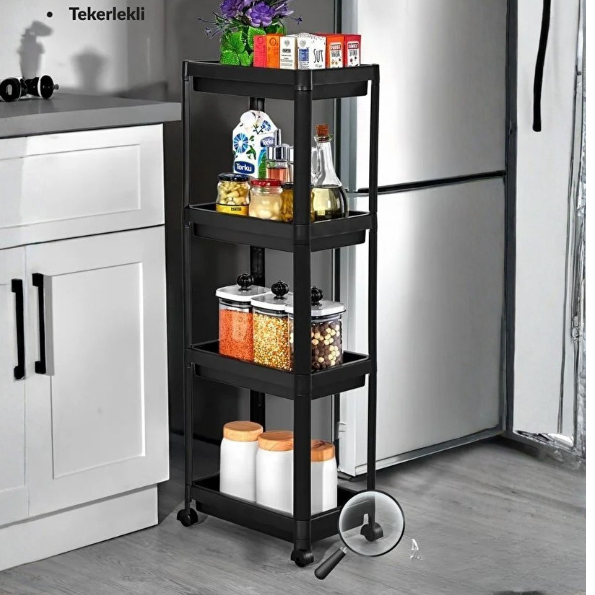 4 Gözlü Banyo Rafı Tekerlekli Siyah