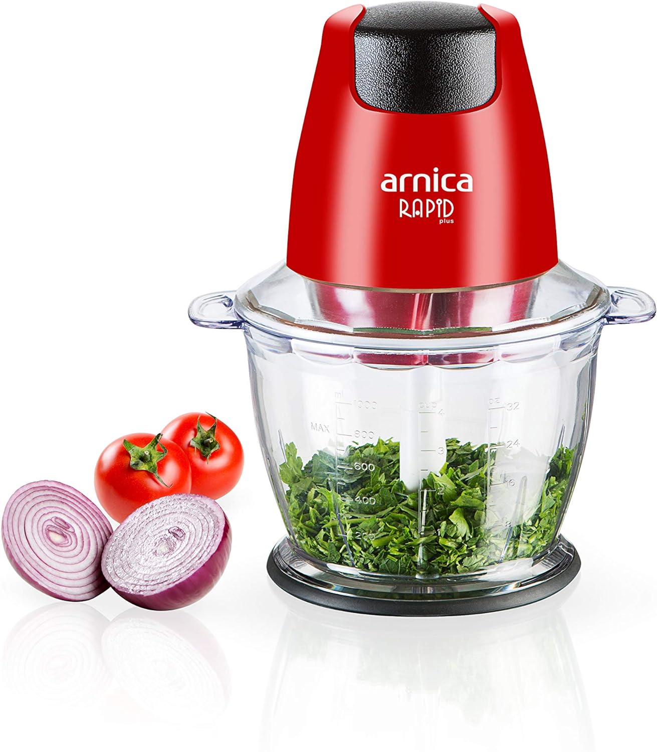 Arnica Rapid Plus Mini Doğrayıcı Kırmızı, ekstra dayanıklı şeffaf haznesi ve dört bıçaklı tasarımıyla sert sebzeleri bile rahatlıkla parçalıyor. Çift katlı paslanmaz çelik bıçak uzun süre keskinlik vadediyor. Cihazıın 500 W'a ulaşan motor gücü sayesinde güçlü bir yardımcıya sahip olabilirsiniz.