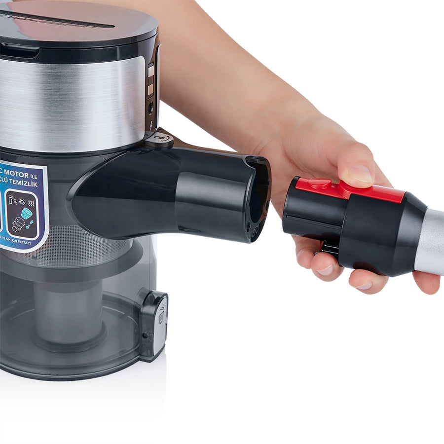 Solara şarjlı dik süpürge, güçlü 2500 mAh lityum iyon bataryası ile uzun süreli temizlik imkanı sunar. Bu batarya, geleneksel pillere göre daha hızlı şarj olur ve uzun ömürlü kullanım sağlar. 45 dakikaya kadar kesintisiz temizlik yapma imkanı sunarak geniş alanları kolaylıkla temizlemenizi sağlar. Şarj fonksiyonlu park istasyonu sayesinde, süpürgeniz her zaman kullanıma hazır durumda olur. Batarya doluluk göstergesi ile pil durumunu kolayca takip edebilir, temizlik planlamanızı buna göre yapabilirsiniz. Evde veya ofiste, Solara ile temizlik artık daha pratik ve zahmetsiz. Bu teknoloji harikası süpürge ile temizliğin keyfini çıkarın!