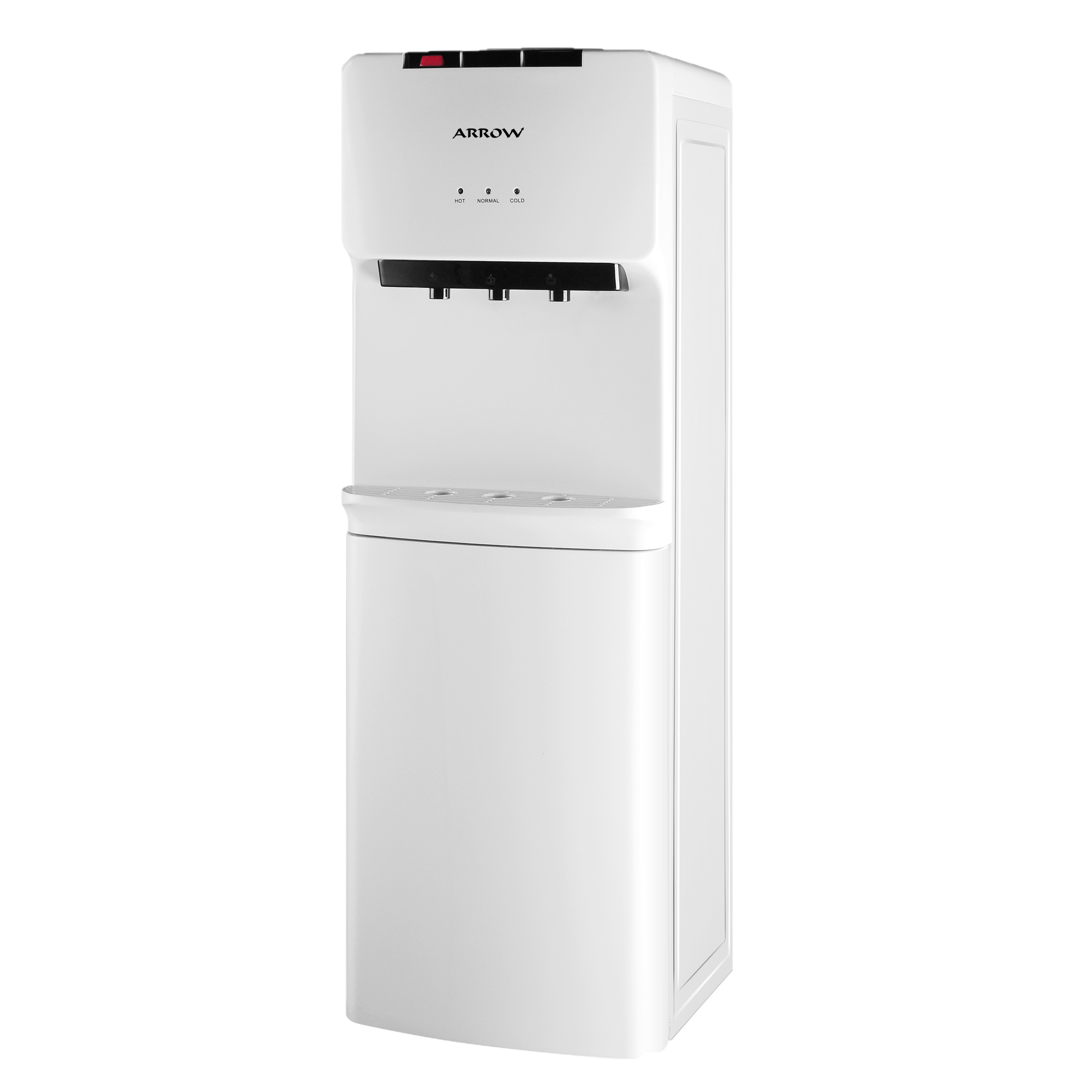 Arrow AR2000 Üstten Damacanalı Sebil, üç çeşmeli tasarımı ile sıcak, normal ve soğuk su seçenekleri sunar. Beyaz renkli bu sebil, kompresör soğutma yöntemi ile suyun etkin bir şekilde soğutulmasını sağlar; soğutma kapasitesi saatte 1,5 litre ve sıcaklık aralığı 5-10°C'dir. Soğutma gücü 85W olarak belirlenmiştir ve kullanılan soğutucu akışkan R134a/30g'dir.