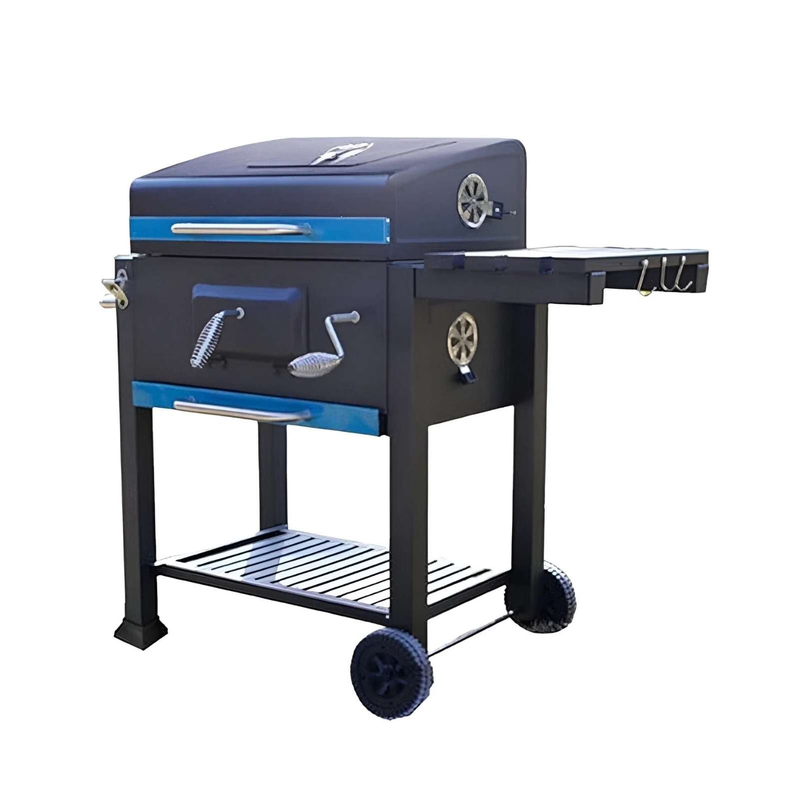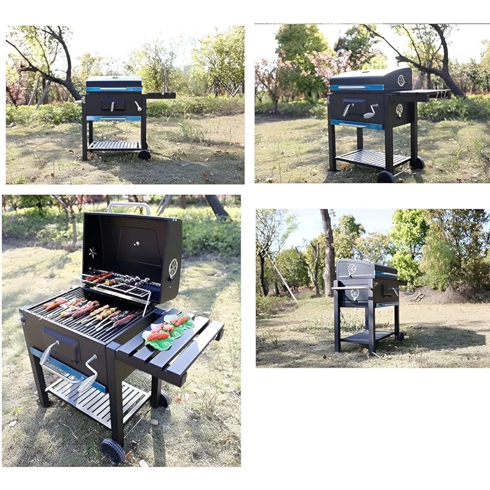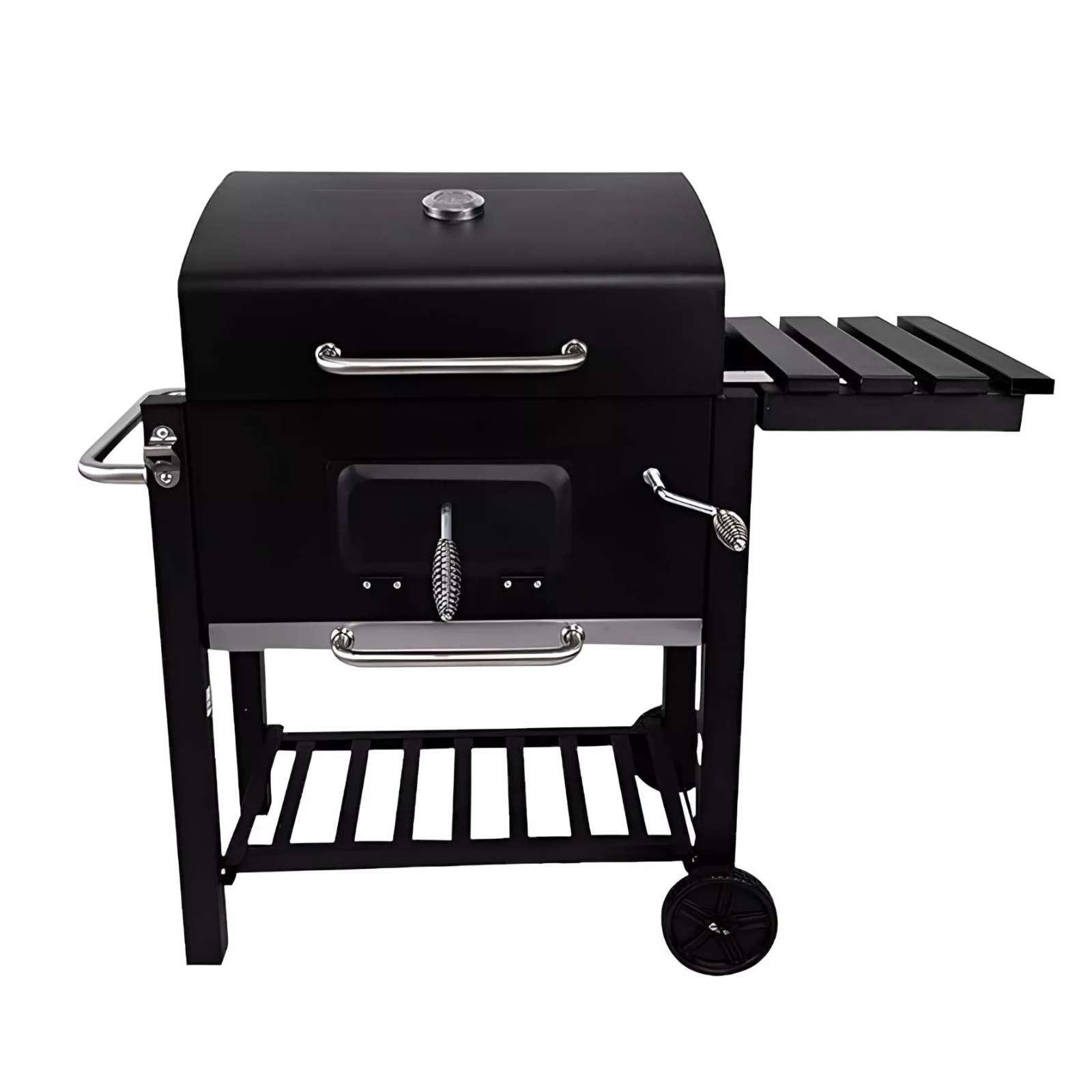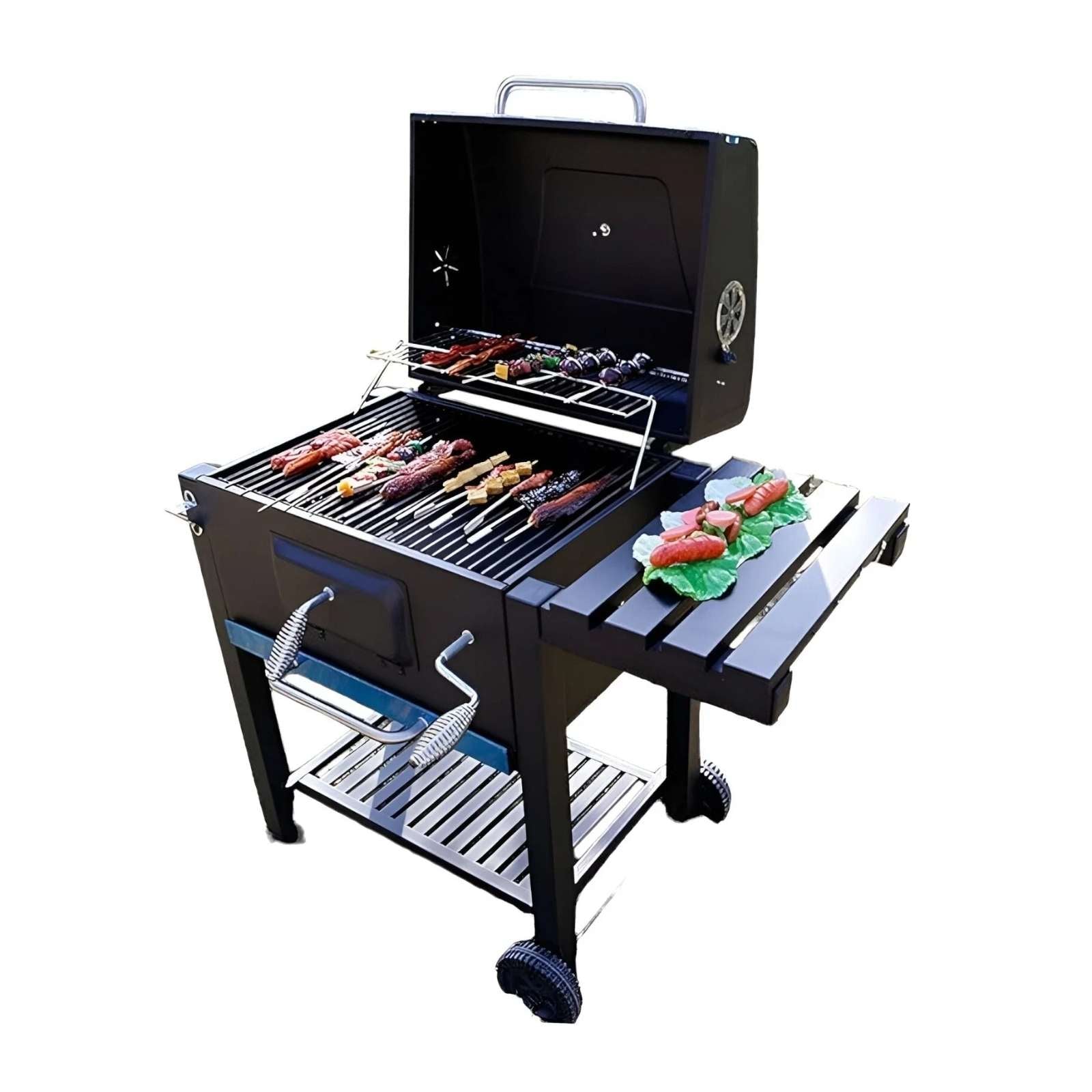 Ürün, ayarlanabilir raflı, termometreli ve tekerlekli bir kömürlü bahçe barbeküsü / mangalıdır.