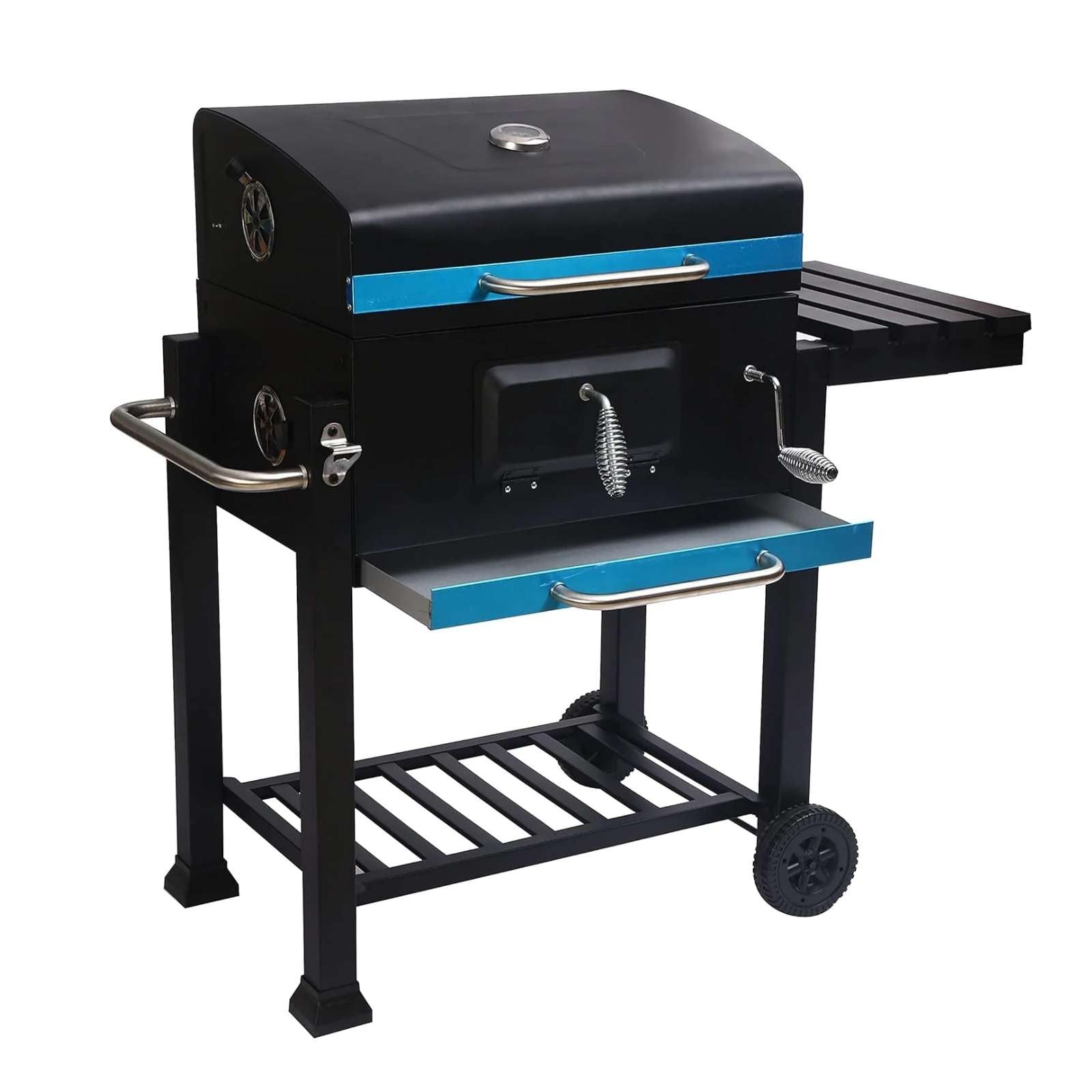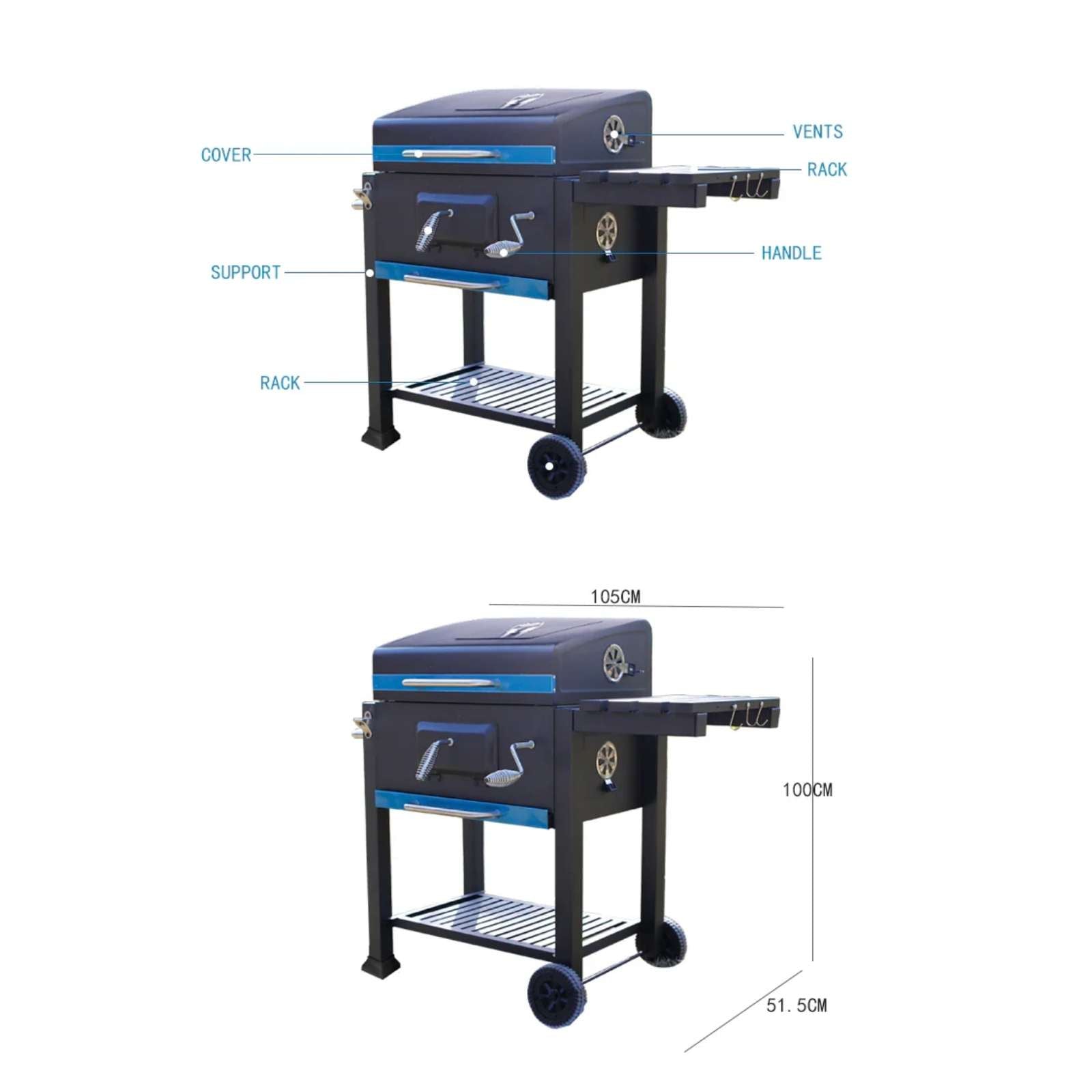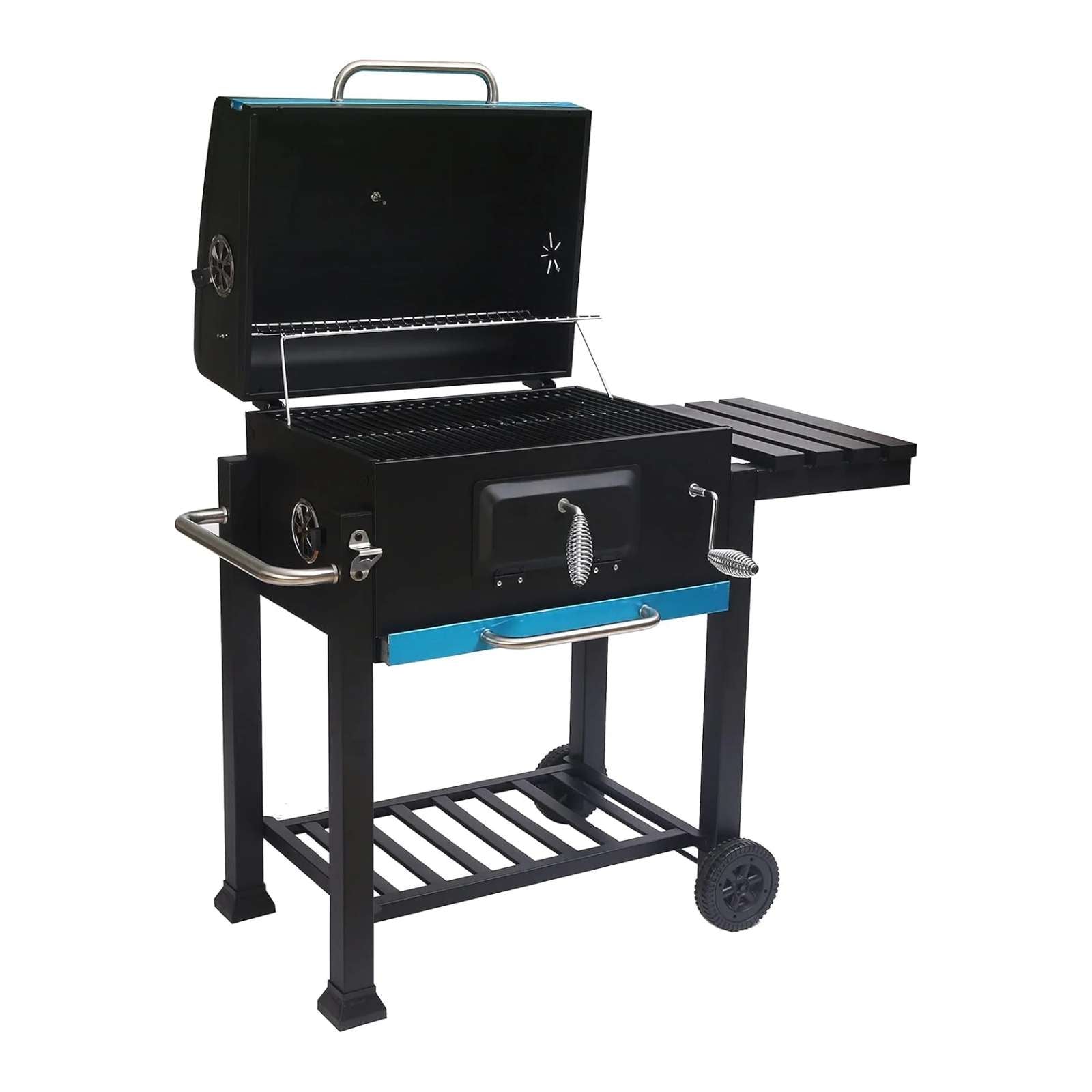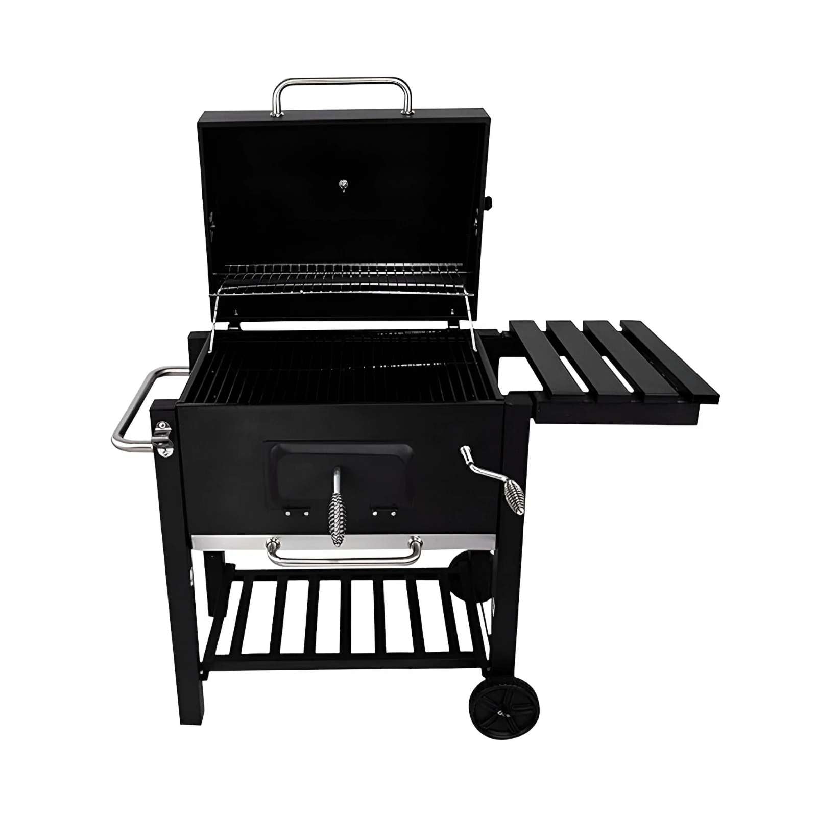 Ürün, ayarlanabilir raflı, termometreli ve tekerlekli bir kömürlü bahçe barbeküsü / mangalıdır.