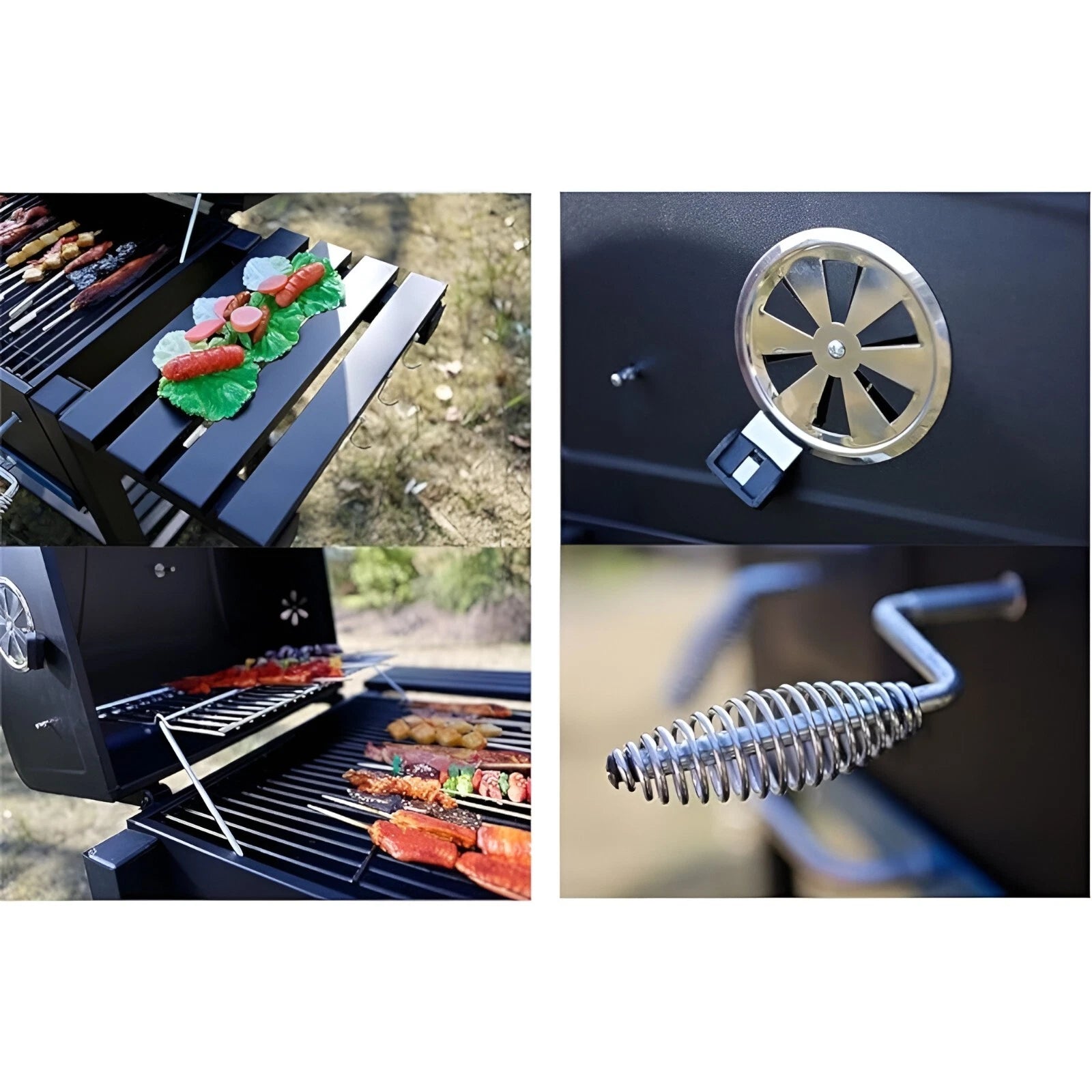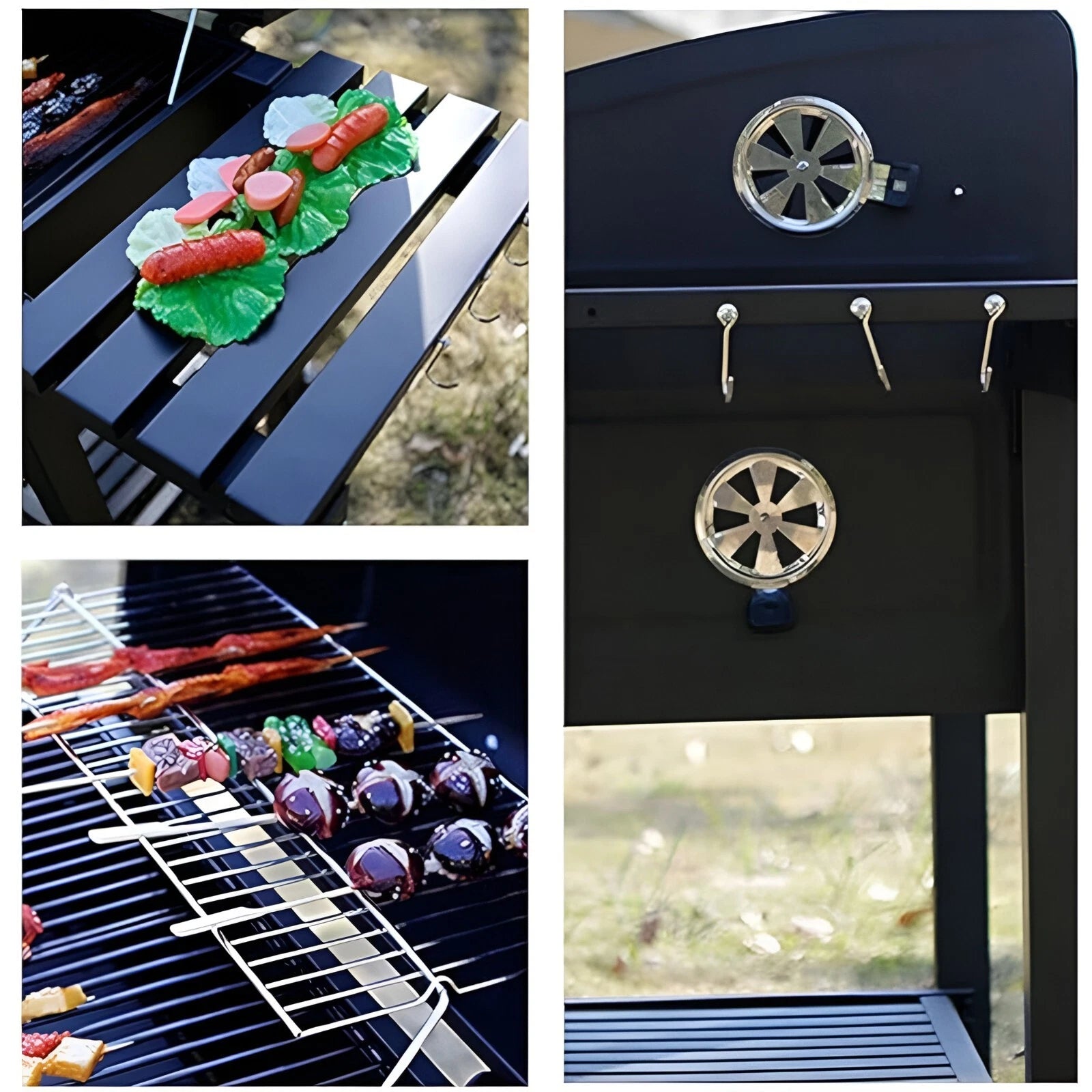 Kapak üzerindeki termometre sayesinde sıcaklığı istediğiniz zaman kontrol edebilirsiniz. İçerideki açılır kapı, kullanım sırasında bile kolayca kömür eklemenizi sağlar. Barbekü sapı sayesinde evin farklı yerlerine kolayca taşınabilir ve en uygun yerde ızgara yapabilirsiniz. Pişirme işlemi sırasında açılıp kapanabilen ızgara üzerinde delikler bulunur. Yiyecekler 47 x 38 cm'lik yan rafa kolayca yerleştirilebilir ve yan kancalar ızgara gereçlerinin asılmasına olanak tanır. Kömür, 47 x 62 cm'lik alt rafa yerleştirilebilir. Kül toplama kutusu kolay temizlik için çıkarılabilir. Izgara ayrıca ön tarafında kullanışlı bir şişe açacağı da sunmaktadır. En deneyimsiz kişiler tarafından bile bir saatten kısa sürede çok kolay bir şekilde monte edilebilir.