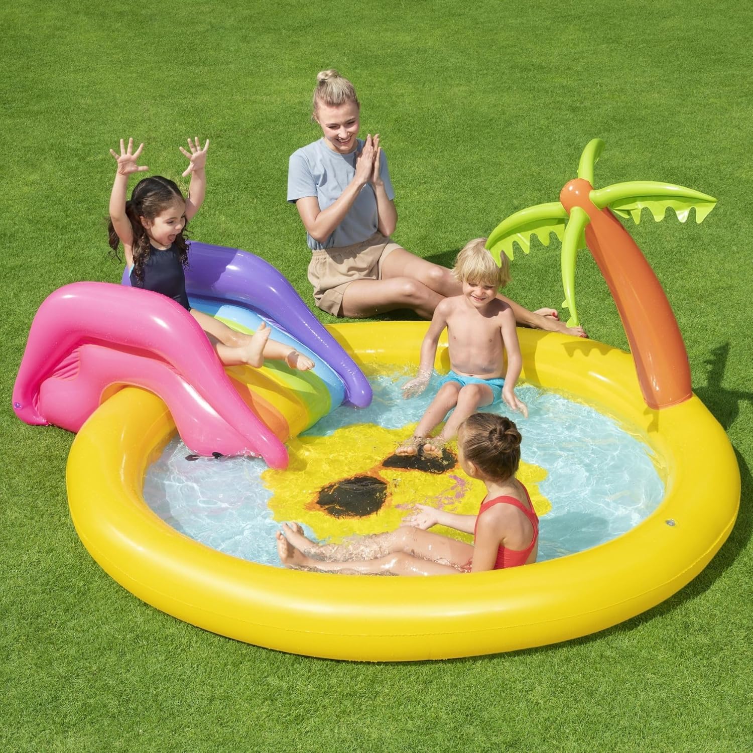 Bahçenizin mahremiyetinde çocuğunuza unutulmaz bir eğlence sunmak ister misiniz? Şişme oyun alanı, onu çocuğunuz için gerçek bir eğlence merkezine dönüştürecektir. Şişme kaydırak ve su çeşmesi bulunan yüzme havuzu, minik yavrunuzu kesinlikle sevindirecek ve onun en sevdiği oyun alanı haline gelecektir. Havuz, yumuşak ama dayanıklı bir malzemeden yapılmıştır ve en küçük çocuklar için mümkün olduğunca güvenlidir. Başlıca ilgi çekici özellikleri çıkarılabilir şişme kaydırak ve bir palmiye ağacıdır.