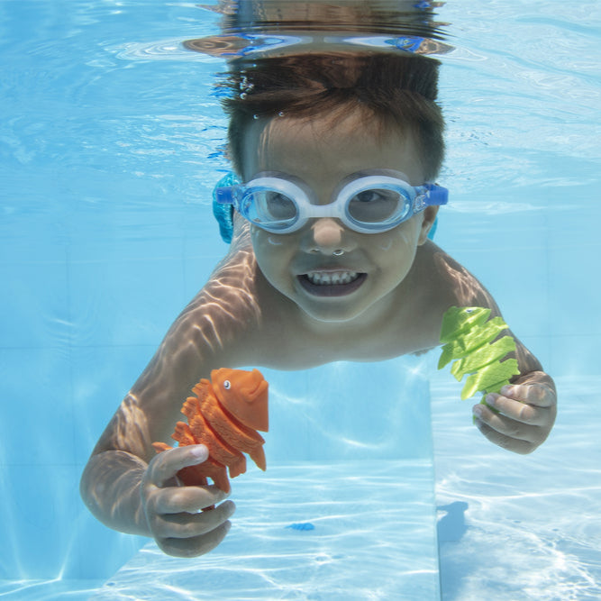 Sizi harika dalış oyuncaklarını keşfetmeye davet ediyoruz! Bu sevimli set 3 renkli balık içerir: turuncu, yeşil ve mavi. 3 yaş üstü çocuklar için yaratılmış olup, motor koordinasyonunun gelişmesine ve yüzmenin öğrenilmesine yardımcı olur. Lateks kullanılmadan üretilmişlerdir, suda güvenli ve keyifli bir eğlenceyi garanti ederler.