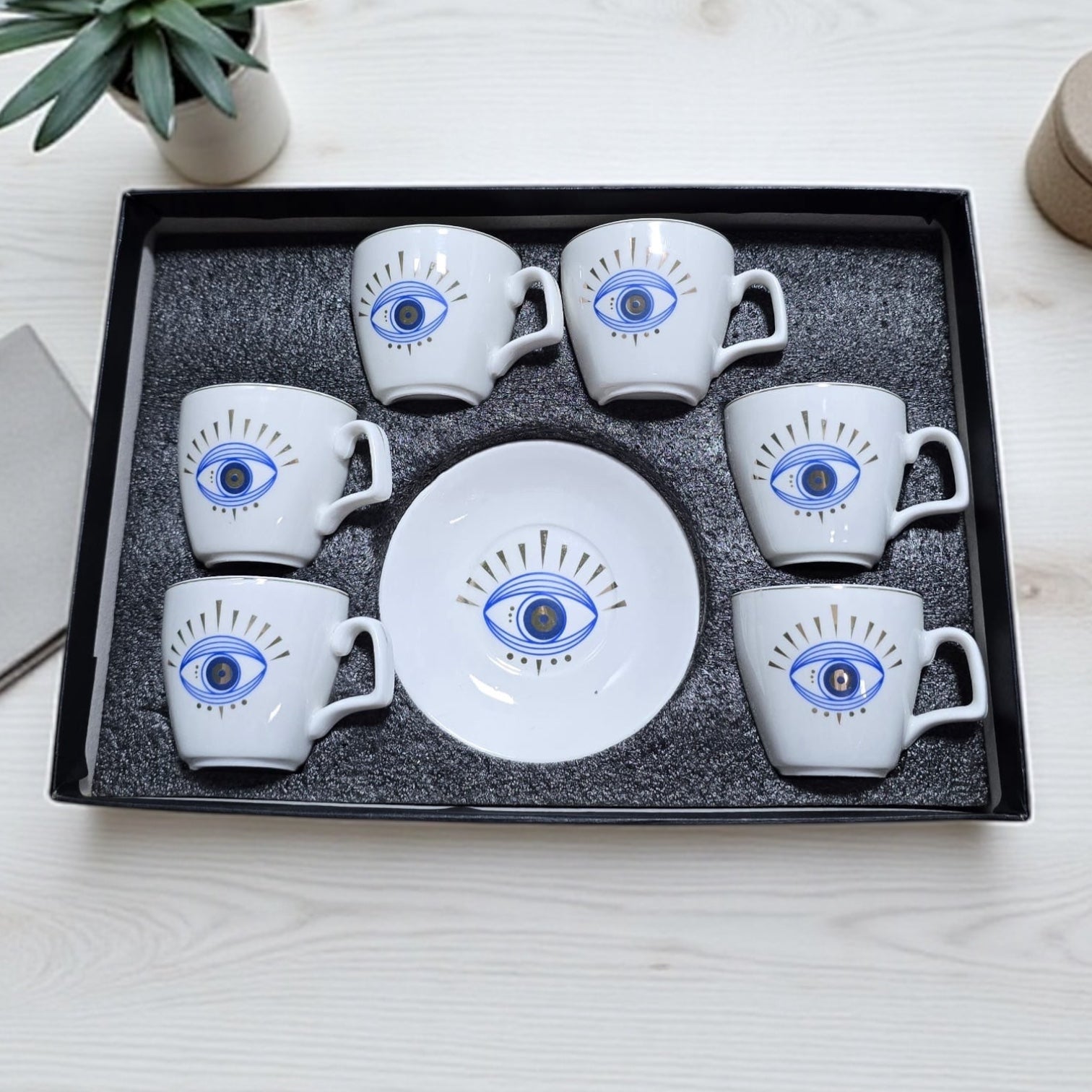 Nazar Boncuğu Işıltılı Göz Desenli 6 Kişilik Kahve Fincan Takımı