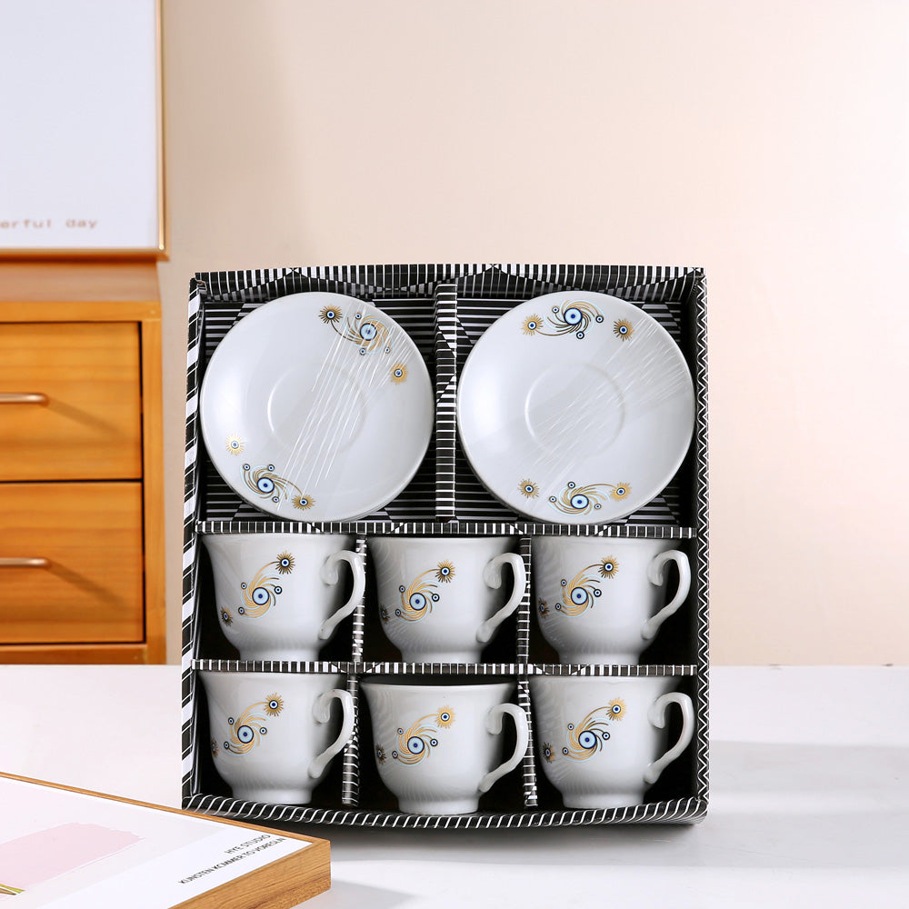 Set, zarif bir desenle süslenmiş altı fincan ve uyumlu tabaktan oluşuyor. Yüksek kaliteli kemik çini, çayınızı daha uzun süre sıcak tutarak genel deneyiminizi zenginleştiriyor.
