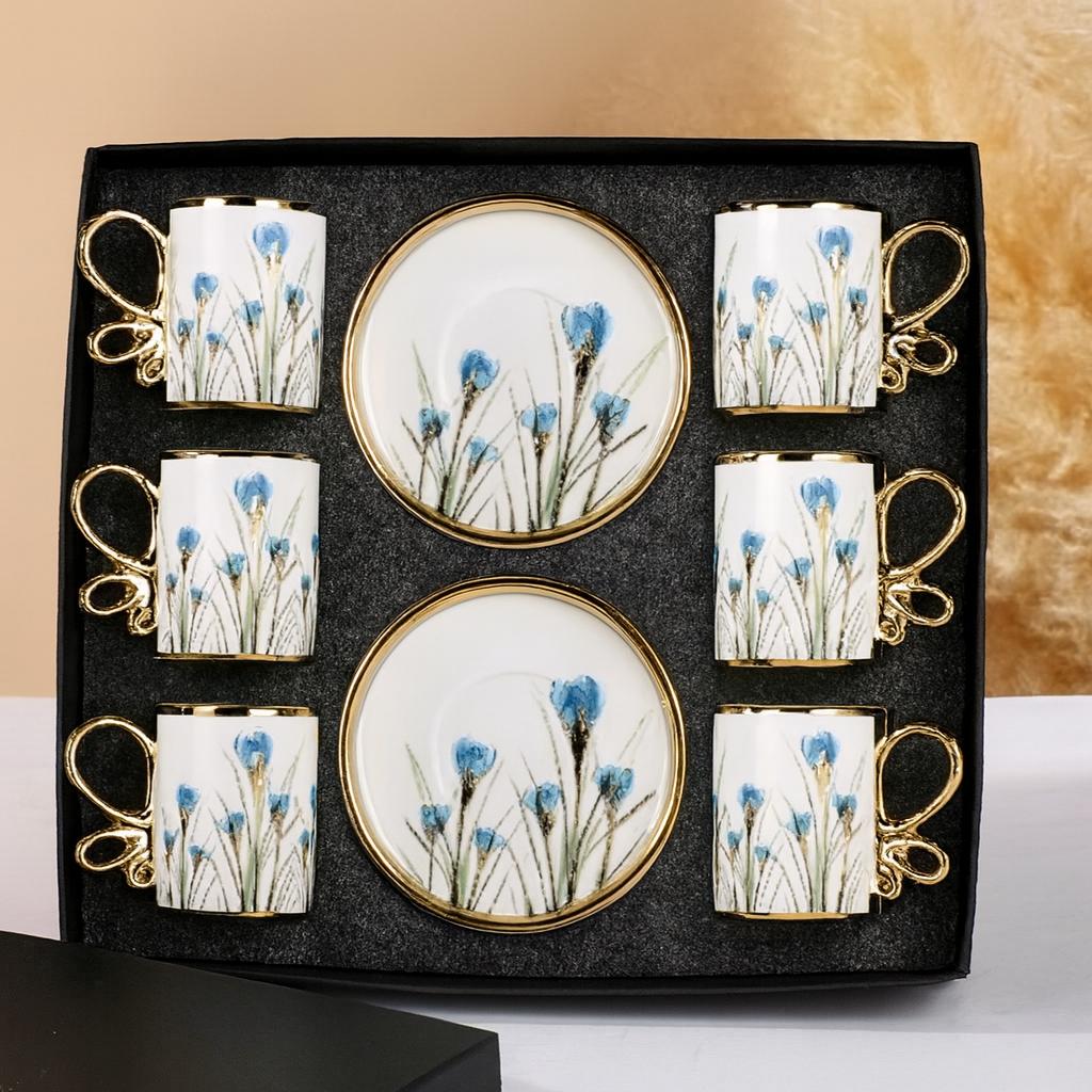 Turkuaz Lale Desenli 6 Kişilik Kahve Fincan Takımı