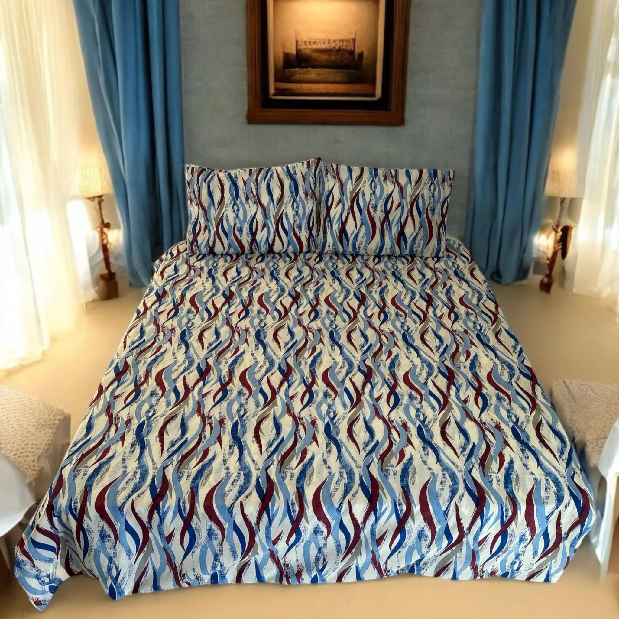 Mavi Bordo Dalgalı Çift Kişilik Lastikli Nevresim Takımı